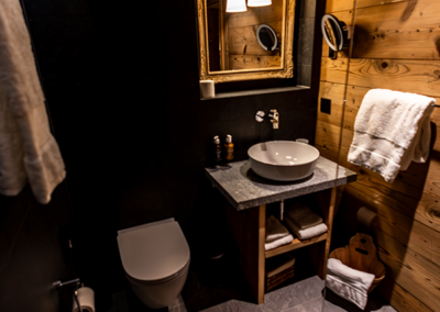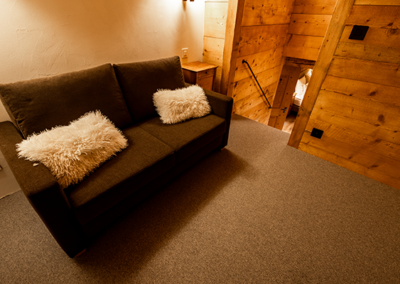 La Bleue, avec son alcôve, est idéale pour se ressourcer et prendre du repos après une belle journée au grand air. Cettechambre familiale invite à la détente, entre douceur alpine et confort partagé, un véritable cocon pour petits et grands.