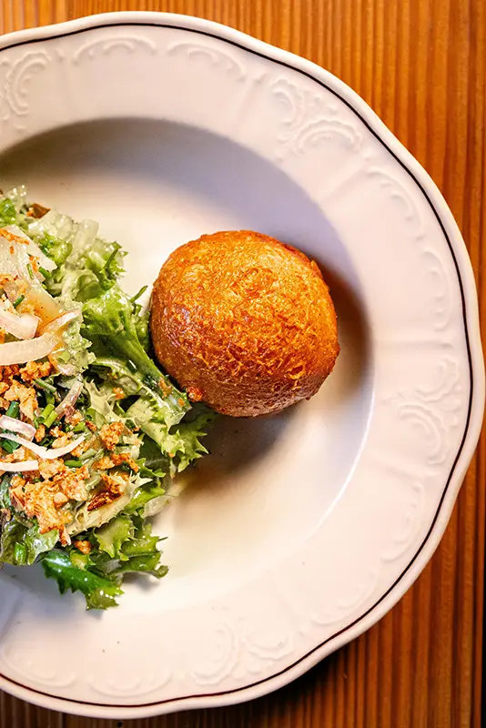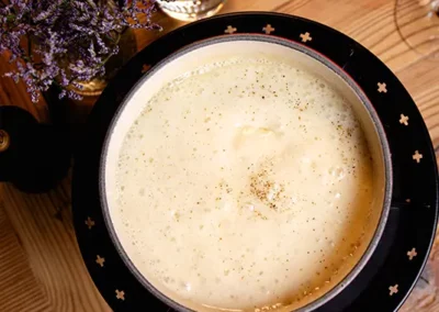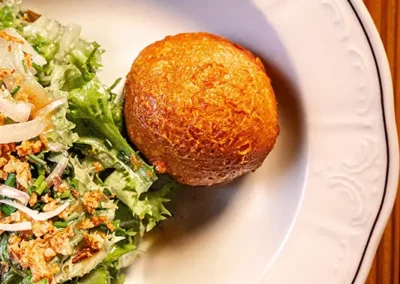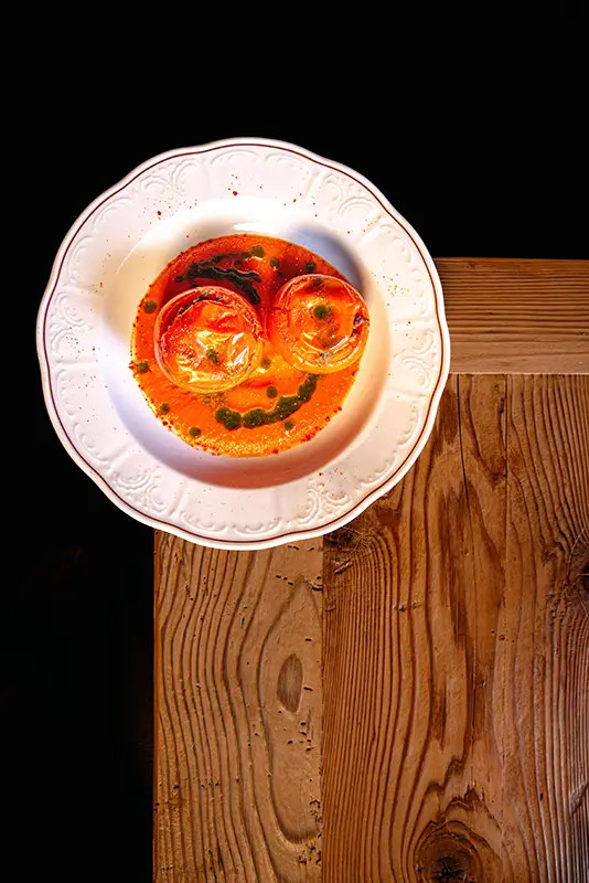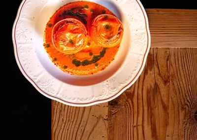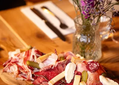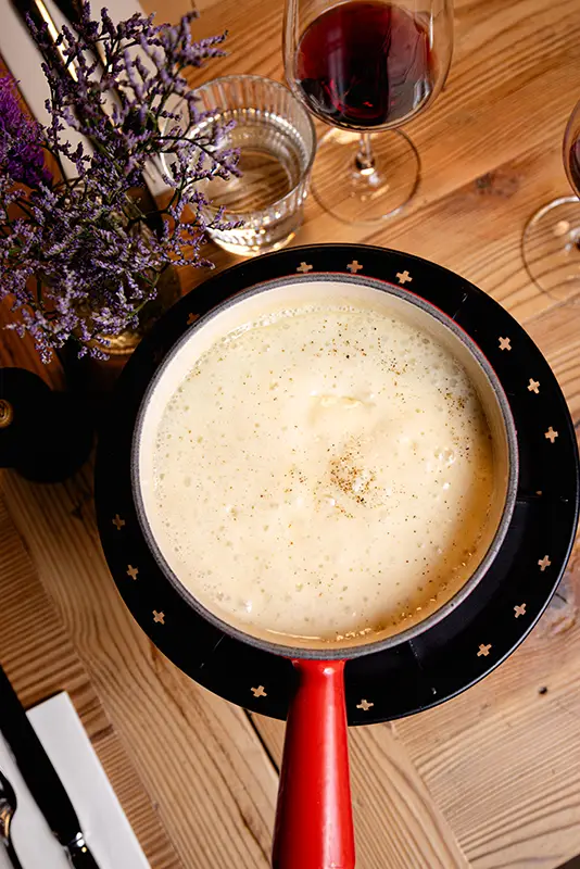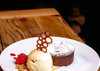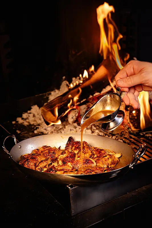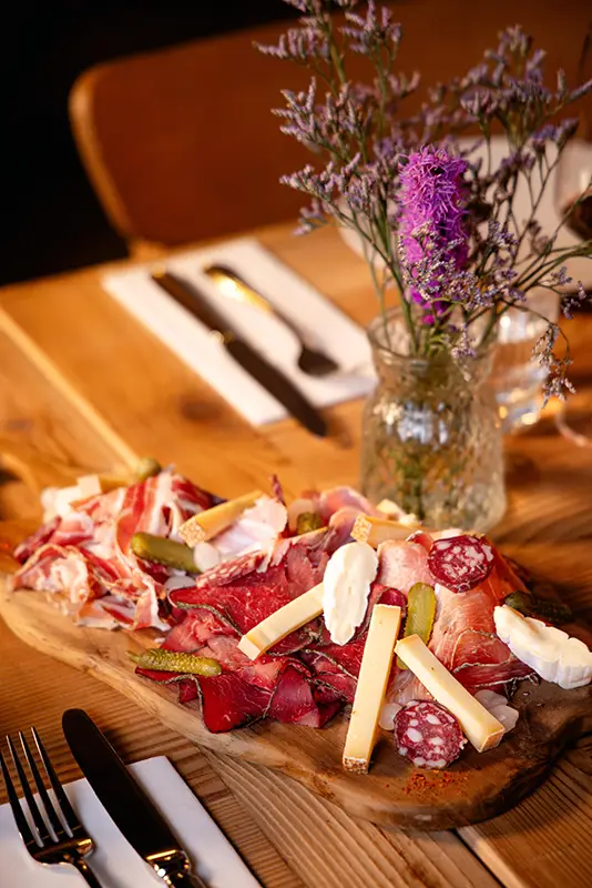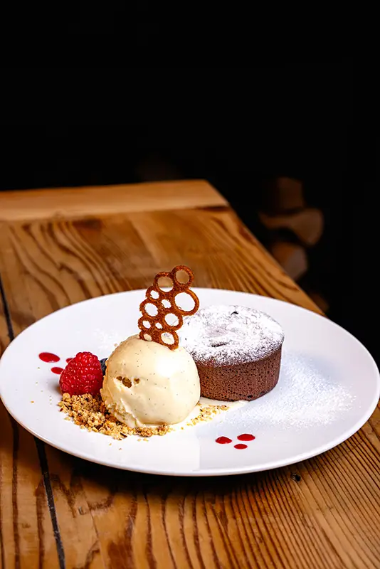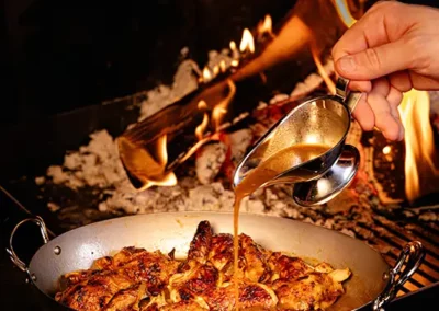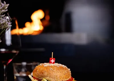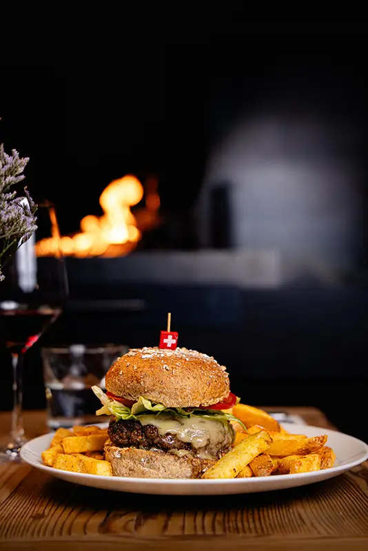 Tout commence par une entrée de saison : tomate farcie en été, chou farci en hiver, tous deux garnis d’une farce maison préparée selon la recette familiale d’un des propriétaires. Puis vient la star de notre rôtisserie : le coquelet cuit au feu de bois. Conseillé avec, un rösti maison à la fois fondant et croustillant, accompagné d’une salade fraîche pour équilibrer le tout. Des crus de caves valaisannes et des découvertes originales d’autres régions complètent votre expérience gourmande, en parfaite harmonie avec notre cuisine.